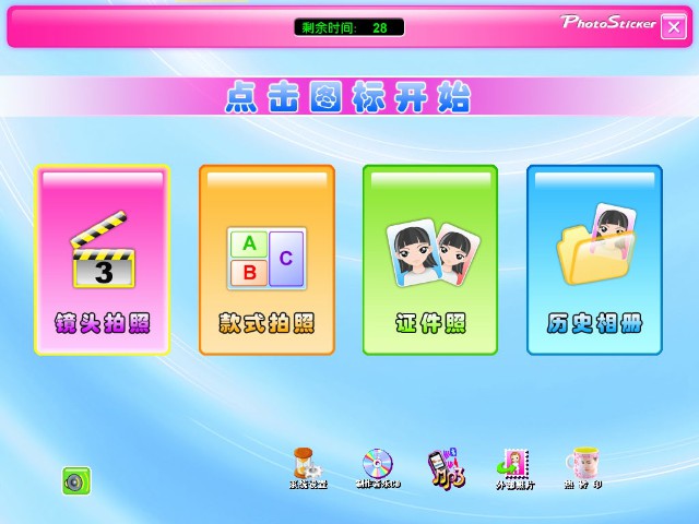最常用的項(xiàng)目,點(diǎn)擊該大圖標(biāo)按鈕后將首先選擇鏡頭數(shù),確定鏡頭數(shù)量后進(jìn)入拍照流程進(jìn)行拍照、裝扮和打印等流程。