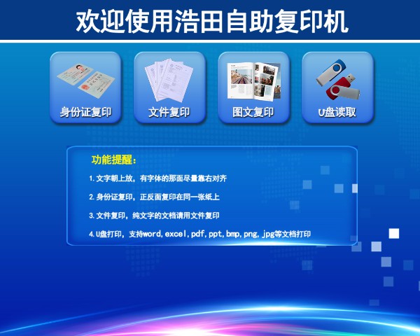 界面上有【身份證復印】【文件復印】【圖文復印】【U盤讀取】可選
