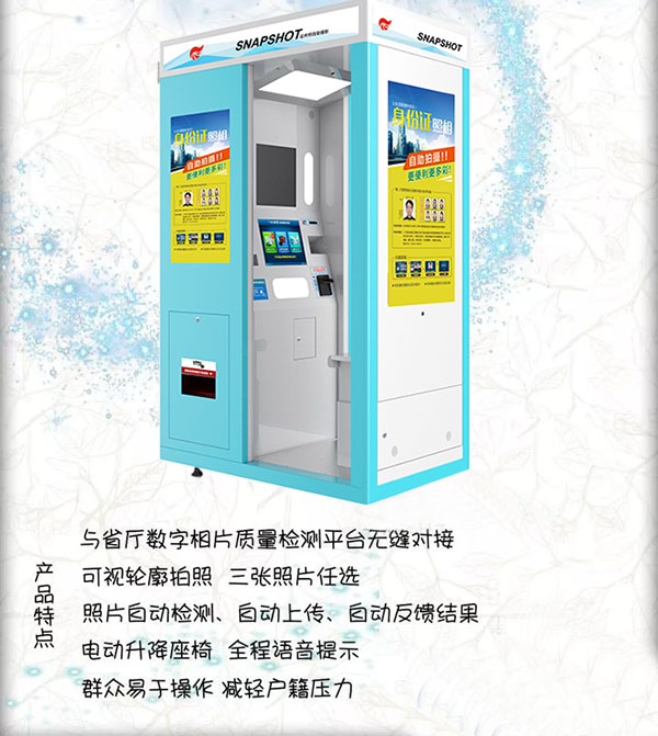 隨著社會經濟以及科學技術的發展,智能化辦公使我們的生活越來越自助化、標準化、智能化!浩田自助攝影亭擁有標準化的拍照環境,確保相片質量,讓拍身份證照和照鏡子一樣簡單,自己的表情自己作主,滿意哪張就選哪張,并且實現完全自助,節省人力,模塊化設計,讓維護變得簡單,模式簡單,收益快!